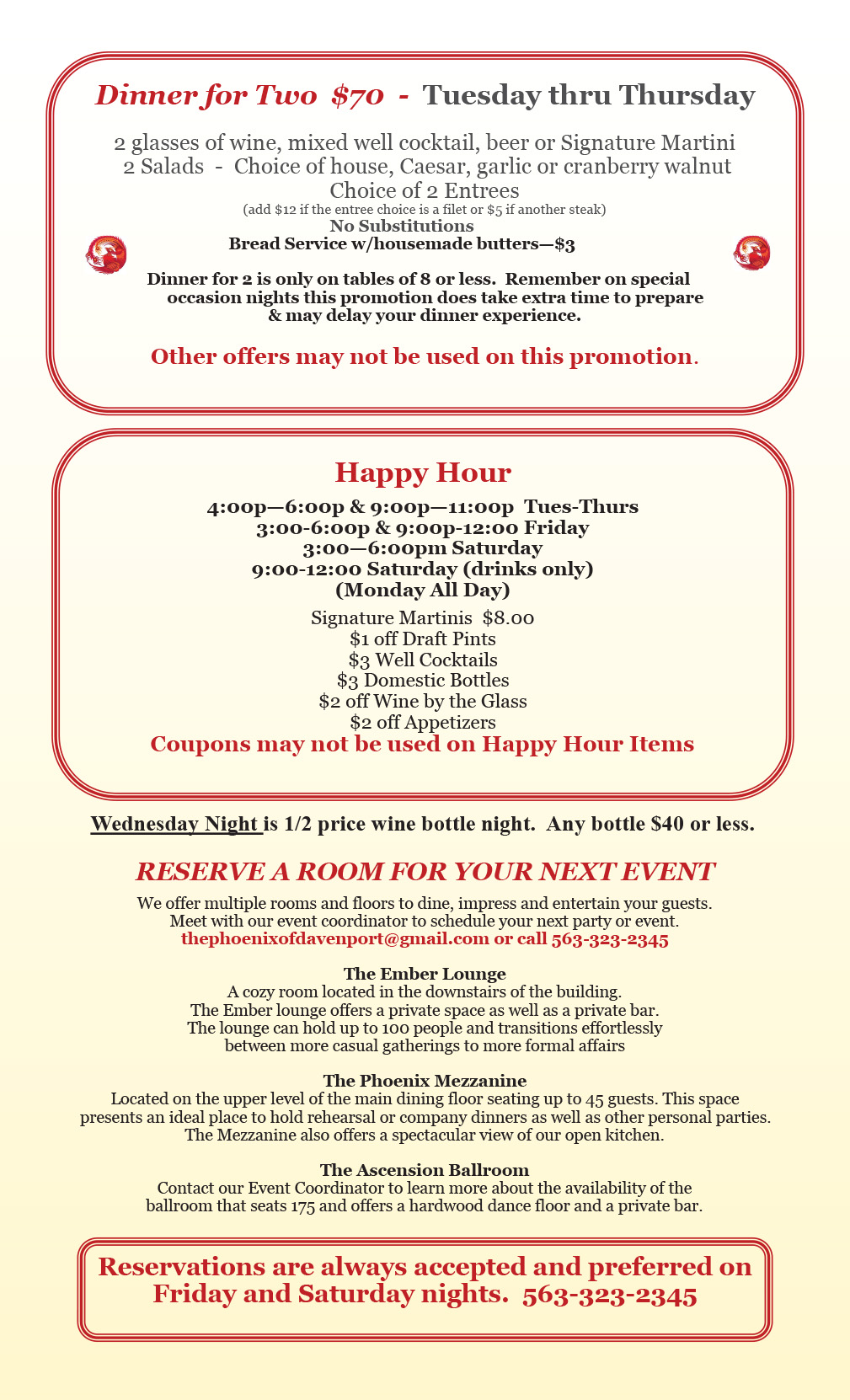 The Phoenix in Davenport, Iowa has an extensive, mouth watering menu to satisfy your most curious appetite. We offer banquets, fine dining, extraordinary martini selection, and a very extensive wine list for your pleasure.